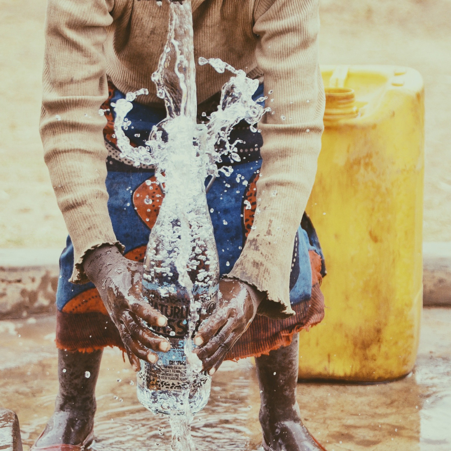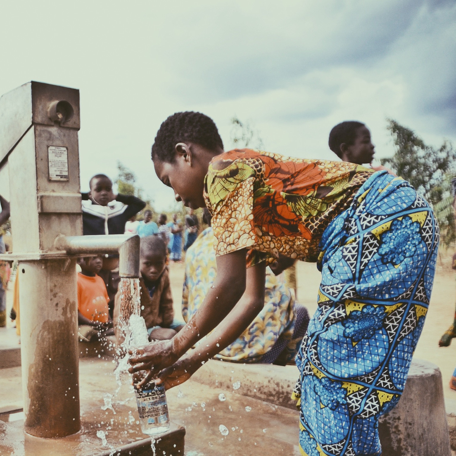 Kinder stehen um einen Brunnen und füllen Flasche mit KUMANGA Print auf